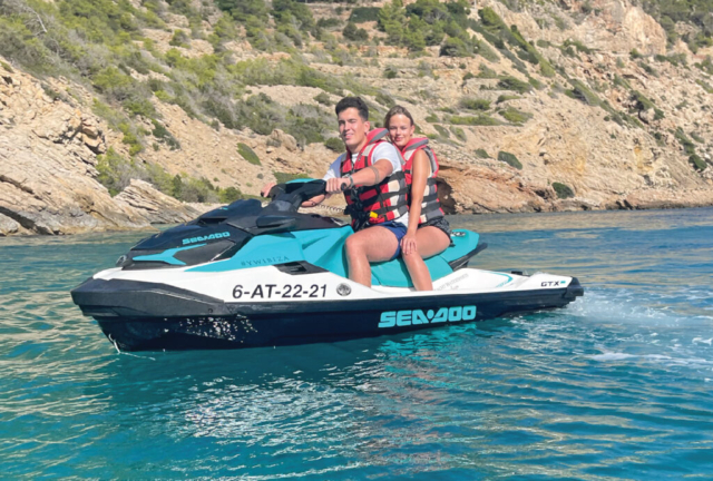 We take clients out in groups of up to 4 Jetskis with an instructor leading the way. Our 1 Hour Jet-Ski Tours normally go to the Tago Mago Private island, with a brief stop there for changing drivers or a quick swim (if client wants to) and back to Marina Santa Eulalia. Along the way we pass by beautiful bays such as Cala Nova and Cala Boix. Along the way, the instructor will take photos of clients and if sea conditions permit it, he will also take some video. Clients drive their own jetski and there is no need for a license.